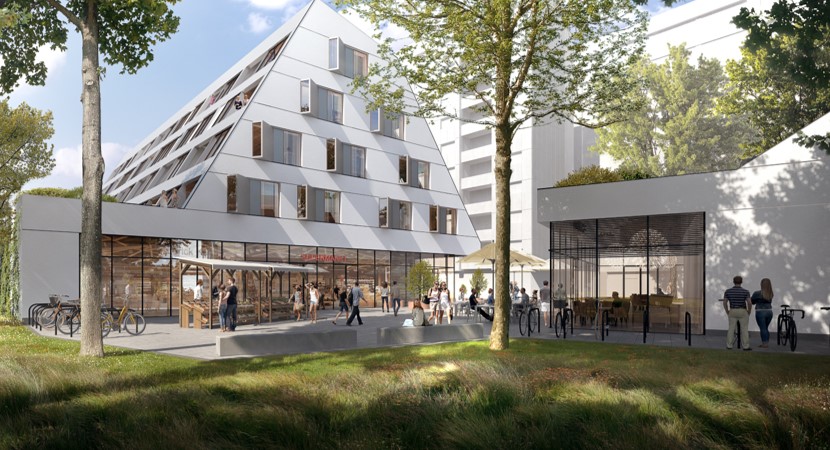 Erdgeschoß: Supermarkt und Gastronomie mit Außenbereich